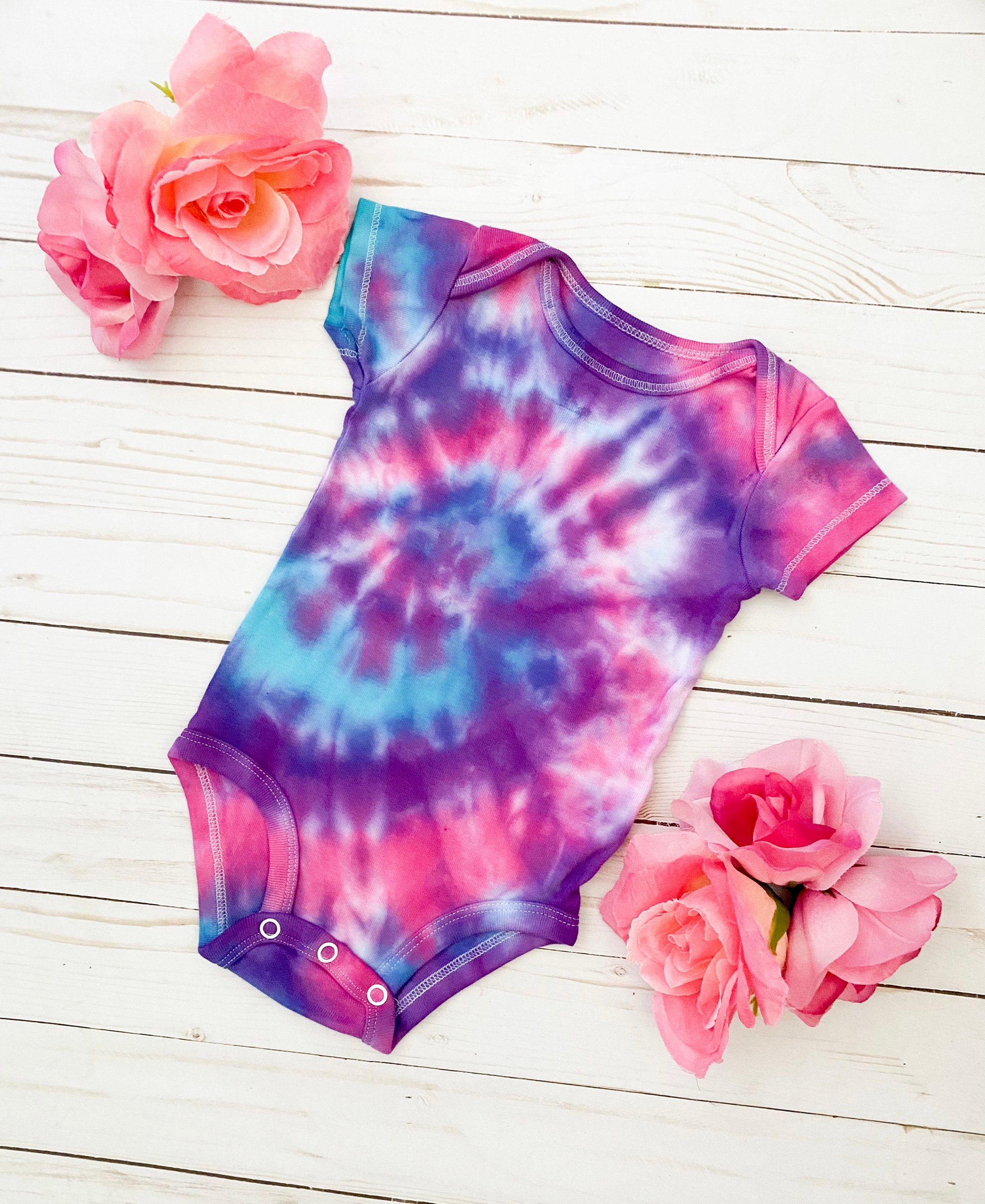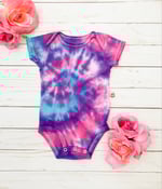 Pink, purple and blue swirl tie dye baby bodysuit in short sleeves size 3M (fits 0-3 months)
